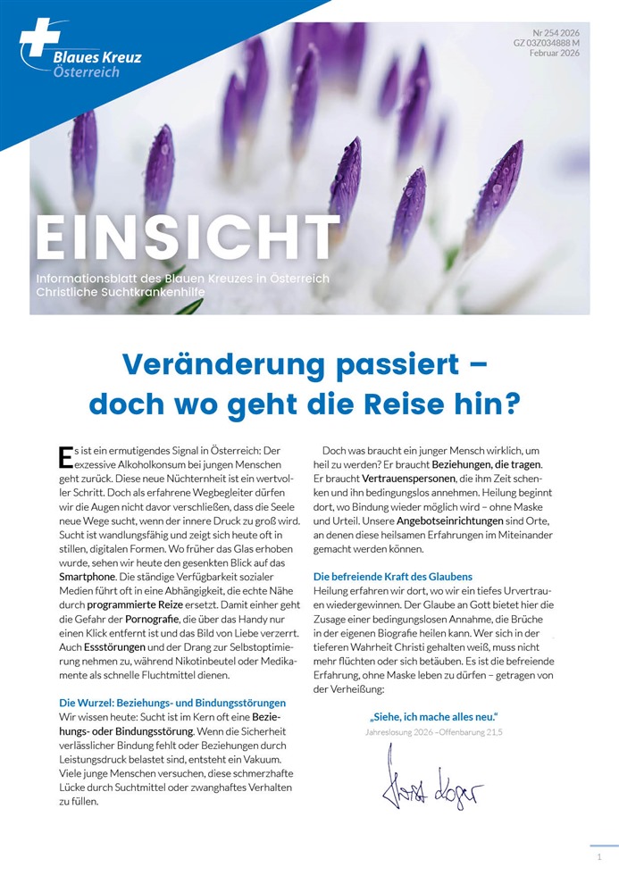 Die Versandkosten der Einsicht steigen ständig an, deswegen möchten wir Ihnen die eMail-Version des Rundbriefes nahe legen. Senden Sie uns eine Nachricht an info@blaueskreuz.at um die postalische Version abzubestellen. Sollten Sie die eMail-Version des Rundbriefes erhalten wollen, können Sie diesen Link benutzen: Einsicht abonnieren HIER KLICKEN.